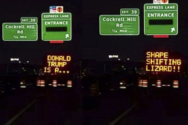 Los letreros electrónicos, que pueden ser manipulados desde una computadora por alguien que conozca las claves y las formas de accesarlos, fueron utilizados para referirse al candidato republicano a la presidencia de Estados Unidos como “lagartija que cambia de forma”.
