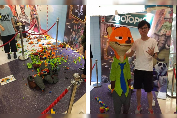 En una exhibición, la estatua de Lego en tamaño real del artista Zhao, sobre el personaje “Nick Wilde”, protagonista de la cinta animada Zootopia, fue destruida por un niño al ser empujada accidentalmente.
