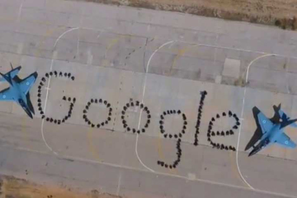En las imágenes de un video, se puede apreciar a un centenar de soldados parados bajo el sol intenso, junto a un par de aviones en una formación que delineaba al logotipo de Google.