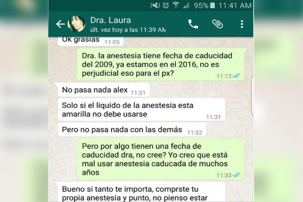 “No pasa nada Alex…solo si el líquido de la anestesia está amarilla no debe usarse”, respondió la presunta dentista.