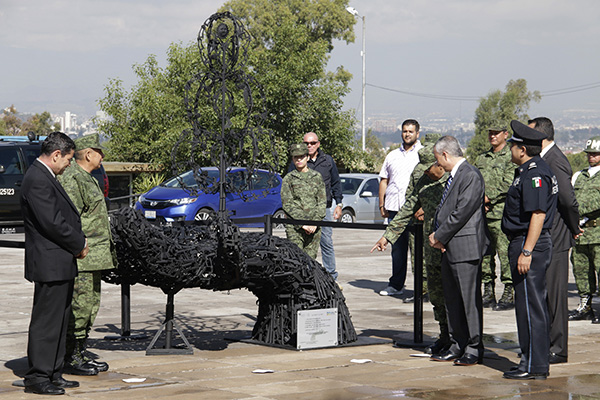 Una escultura hecha con armas de fuego decomisadas fue develada esta mañana en Los Fuertes por personal de la Secretaria de la Defensa Nacional y el titular de la Fiscalía General del Estado, Víctor Carrancá Bourget.