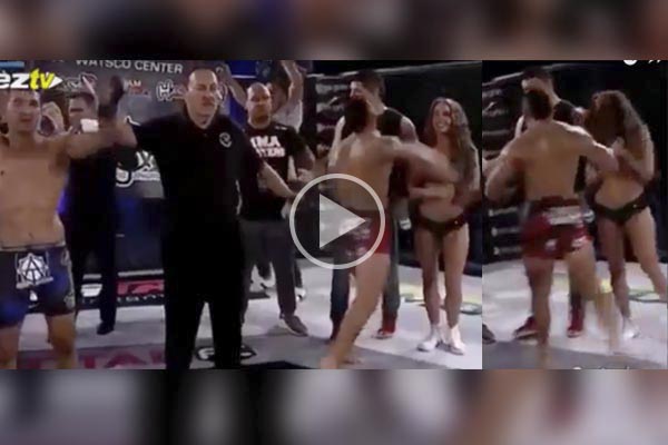 Esta situación provocó el enojo del peleador, que soltó un golpe al aire sin darse cuenta que estaba la edecán muy cerca de él y la mandó a la lona.