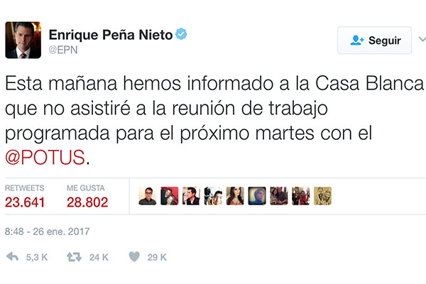 “Esta mañana hemos informado a la Casa Blanca que no asistiré a la reunión de trabajo programada para el próximo martes con el @POTUS”, precisó en su cuenta de Twitter @EPN.