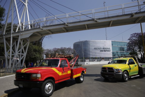 Varías grúas de colores rojo y amarillo fueron atravesadas sobre el bulevar, frente a la Fiscalía General del Estado. Dicho edificio es resguardado por policías ministeriales.