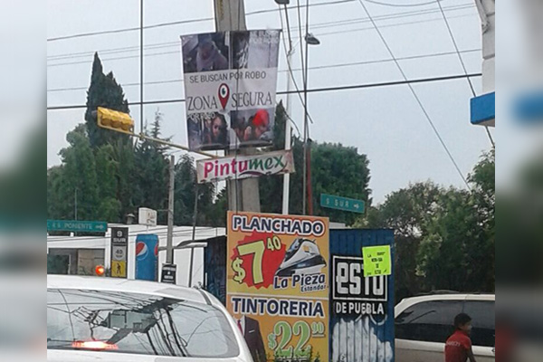 En colonias aledañas al bulevar Valsequillo han comenzado los ciudadanos a buscar a los delincuentes, pues están pegando fotografías de los ladrones para darles su merecido, según puede observarse en lonas.