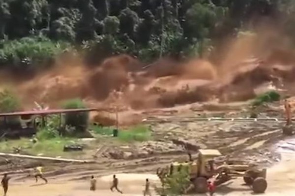 Un impactante video, captado en el distrito de Thathom, Laos, muestra cómo unos obreros corren aterrados para salvar sus vidas de una mortal ola que originó el colapso de una presa cercana.