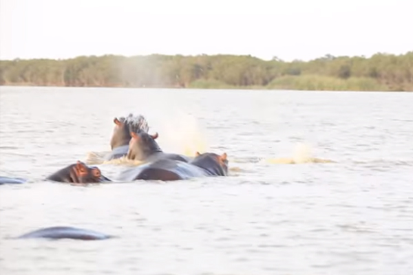 Un rebaño de hipopótamos se enojó con un tiburón sarda que invadió su territorio en la costa sudafricana. Afortunadamente, debido a su velocidad, el depredador marítimo logró escapar de los enfurecidos gigantes.
