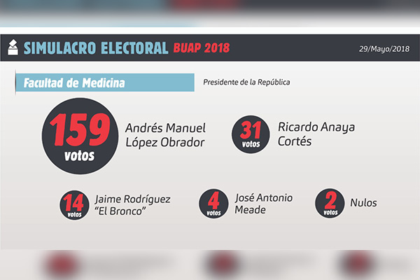 Así, el eterno líder de las izquierdas repetiría la victoria que obtuvo el pasado simulacro electoral de la BUAP, llevado a cabo en 2012, en el que López Obrador consiguió 80 % de las preferencias de la comunidad universitaria.
