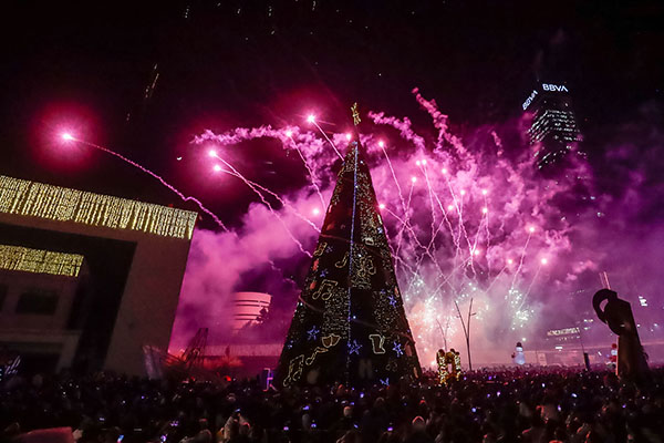 El monumental árbol, de 30 metros de altura cuenta con 93,000 focos LED, 7,200 metros de escarcha, lo que lo convierte en uno de los adornos navideños más grandes e iluminados de la ciudad.
