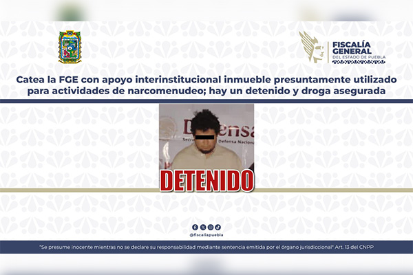 La Fiscalía General del Estado de Puebla realizó con apoyo interinstitucional de la Secretaría de la Defensa Nacional (DEFENSA) y la de Seguridad Ciudadana de Puebla (SSC), acciones para combatir el narcomenudeo en el municipio Cuautlancingo, logrando la detención de Max Emilio N., en posesión de droga.