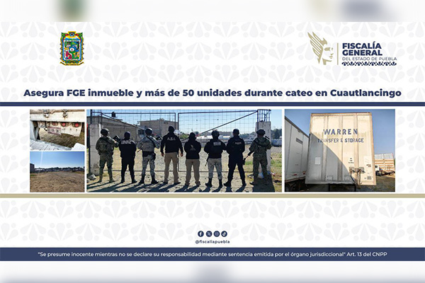 La Fiscalía General del Estado (FGE) ejecutó una orden de cateo en un inmueble ubicado en la calle Los Pinos, en la junta auxiliar de Trinidad Sanctorum, municipio de Cuautlancingo, Puebla.
