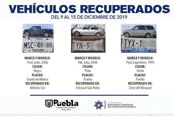Como resultado del reforzamiento de patrullajes preventivos y en atención a diversos reportes ciudadanos, la Secretaría de Seguridad Ciudadana (SSC) del Municipio de Puebla informó que, del 9 al 15 de diciembre del presente año, fueron recuperados siete vehículos con reporte de robo.