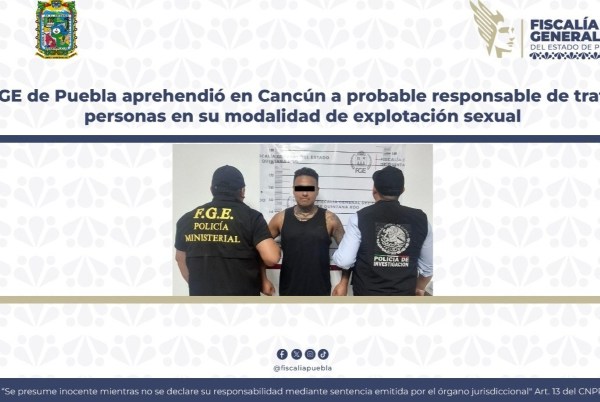 La Fiscalía General del Estado de Puebla, en coordinación con autoridades de Quintana Roo, cumplimentó una orden de aprehensión en el municipio de Cancún, en contra de Omar N., de 33 años de edad, por su probable responsabilidad en el delito de trata de personas en su modalidad de explotación sexual a través de la prostitución ajena, en agravio de su esposa.