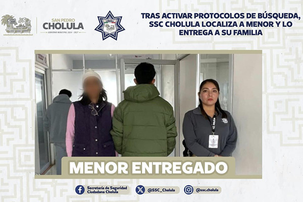 Policías Municipales de la Secretaría de Seguridad Ciudadana (SSC Cholula) localizaron a un menor reportado como desaparecido, luego de activar de manera inmediata los protocolos de búsqueda en San Pedro Cholula.